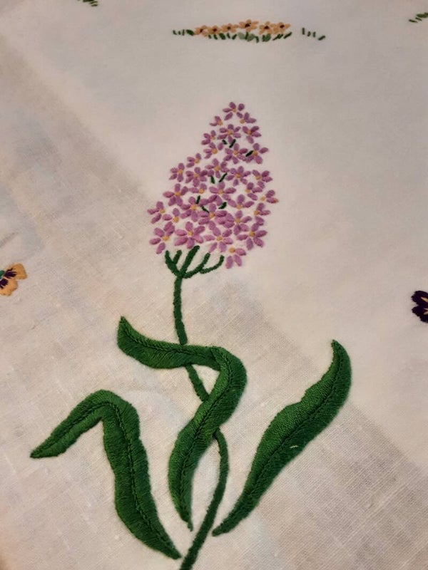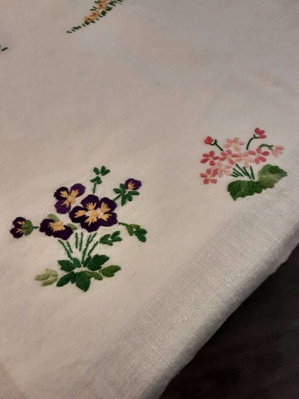 Beautiful Embroidered Linen Floral Design Table Cloth, Very Vibrant Colours.